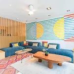 Rummen med färgglad inredningsstil. Bekvämligheterna - tv och Nespressomaskin.